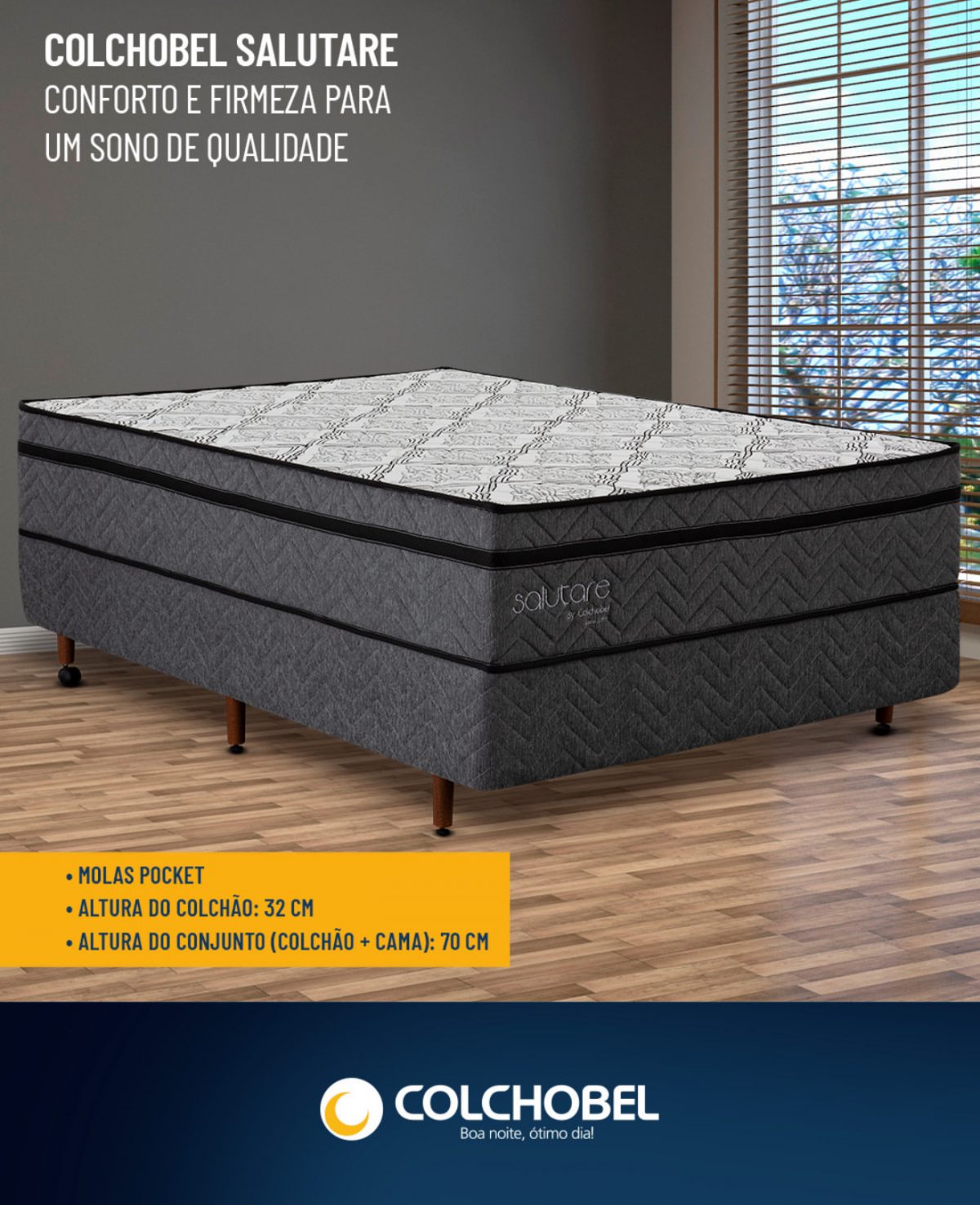 O Colchão Salutare Colchobel é composto por uma camada superior de espuma de alta densidade que se molda ao contorno do corpo do dorminhoco, proporcionando um conforto excepcional. Possui também uma camada de espuma viscoelástica que ajuda a reduzir a pressão nas áreas de maior contato, proporcionando um sono mais tranquilo e revigorante. As molas pocket oferecem um suporte ideal e distribuem o peso de forma uniforme, minimizando a transferência de movimento. A cobertura é feita de tecido macio e durável para proteger o colchão e aumentar o conforto