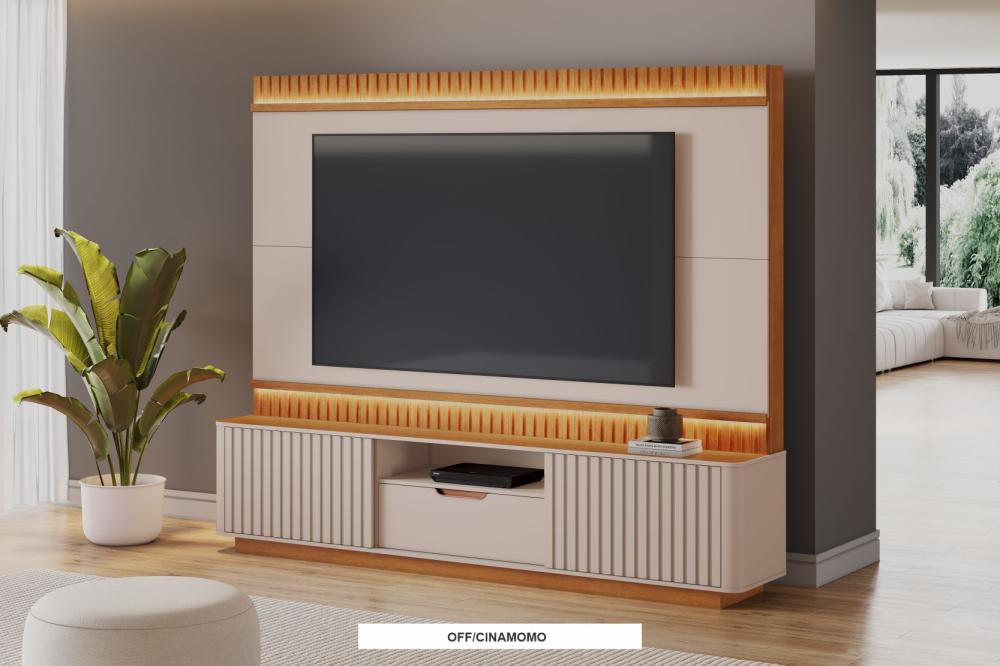 -Painel ripado -Gaveta com corrediça telescópica -Puxador em madeira -Espaço para TV: 1820mm x 1120mm (LxA) -Recomenda-se TV até 65″